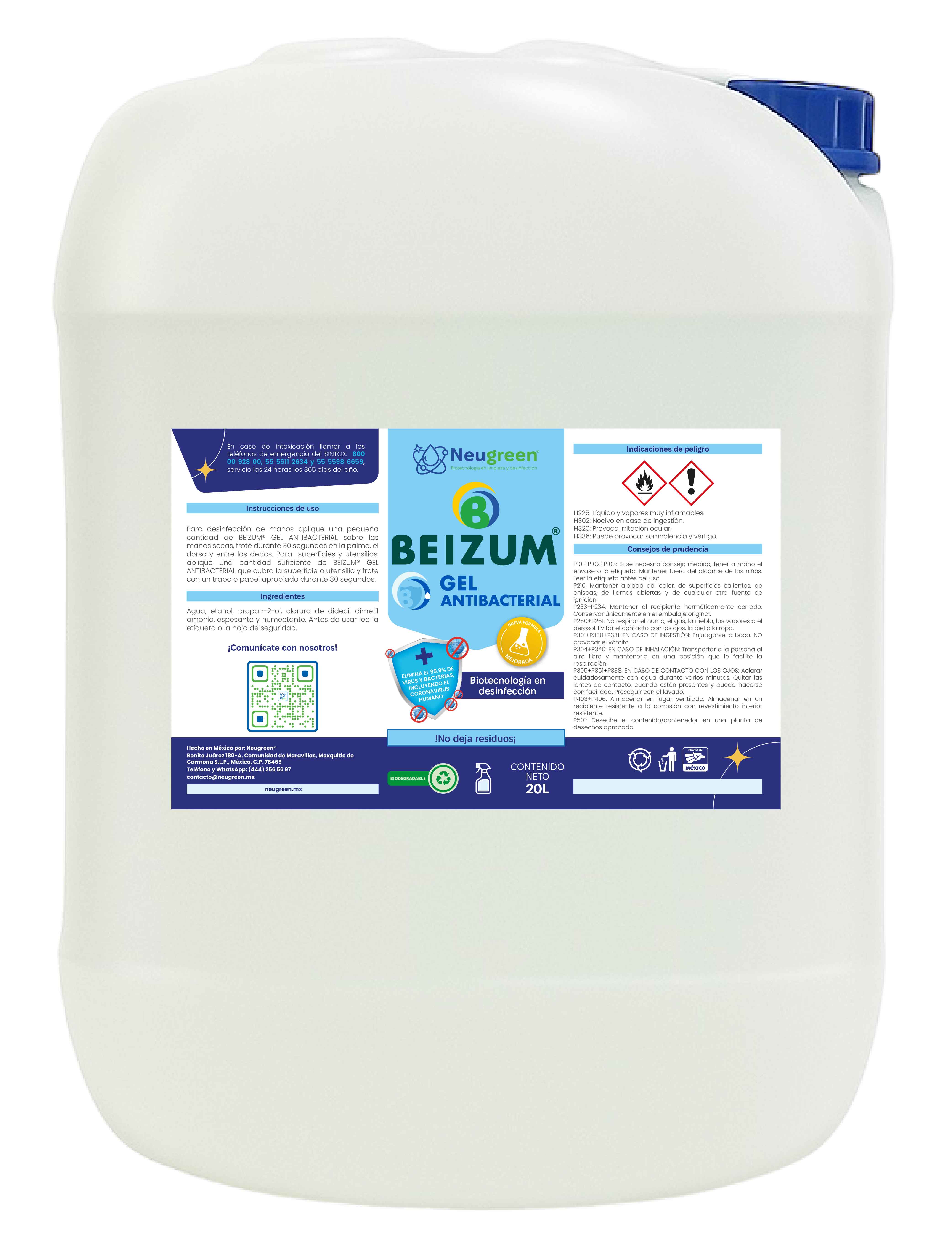 El BEIZUM® GEL es un desinfectante en gel de alto nivel, formulado con etanol al 70% reforzado con sales cuaternarias de amonio de quinta generación, proporcionando una desinfección efectiva y prolongada. Su acción dual elimina el 99.9% de bacterias, virus y hongos, protegiendo la salud en entornos de alto tránsito.