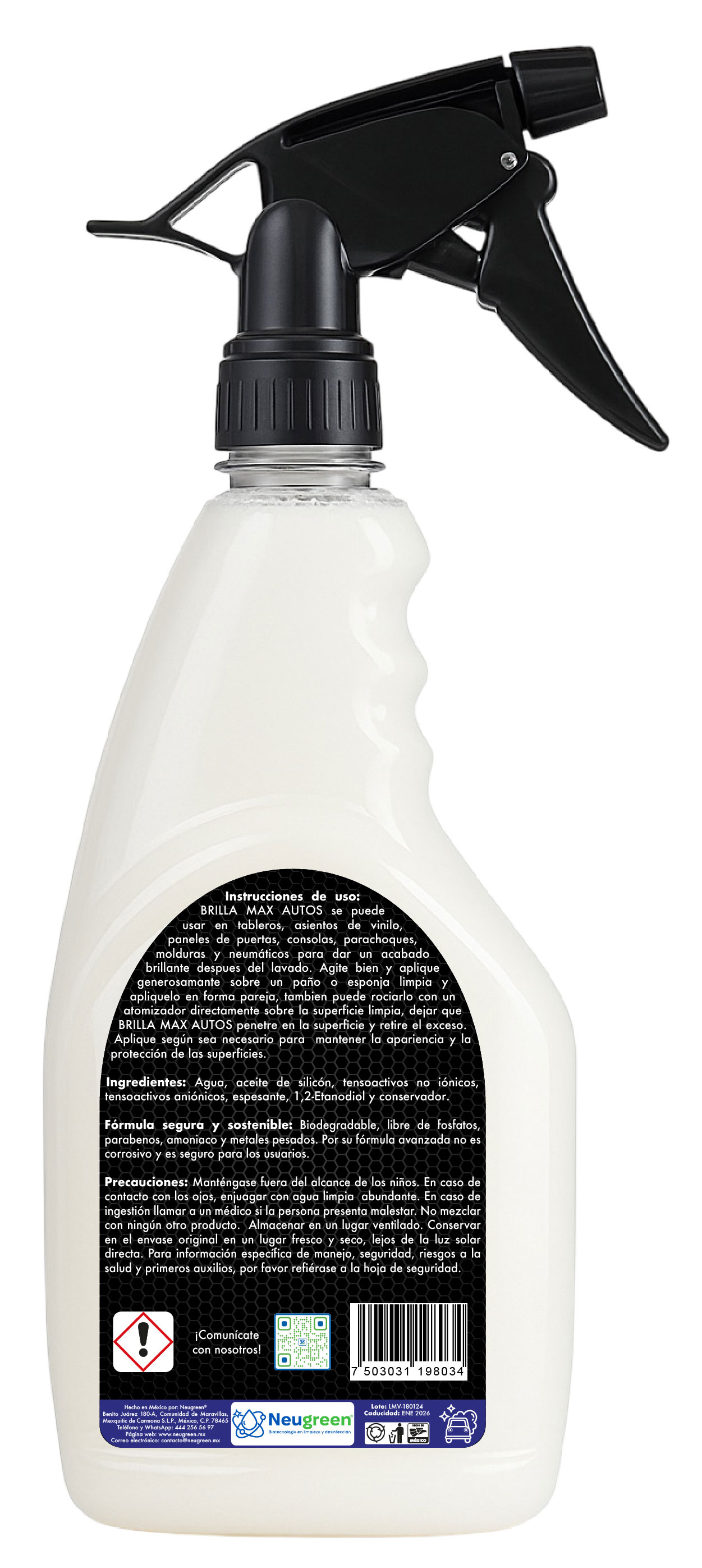 Además de embellecer, crea una película protectora contra polvo, humedad y rayos UV, evitando el resecamiento y las grietas en plásticos y viniles. La venta de 1, 5 y 20L es ideal para distribuidores, talleres de estética automotriz o negocios que buscan un producto rentable y ecológico, reduciendo costos y minimizando el uso de envases desechables.