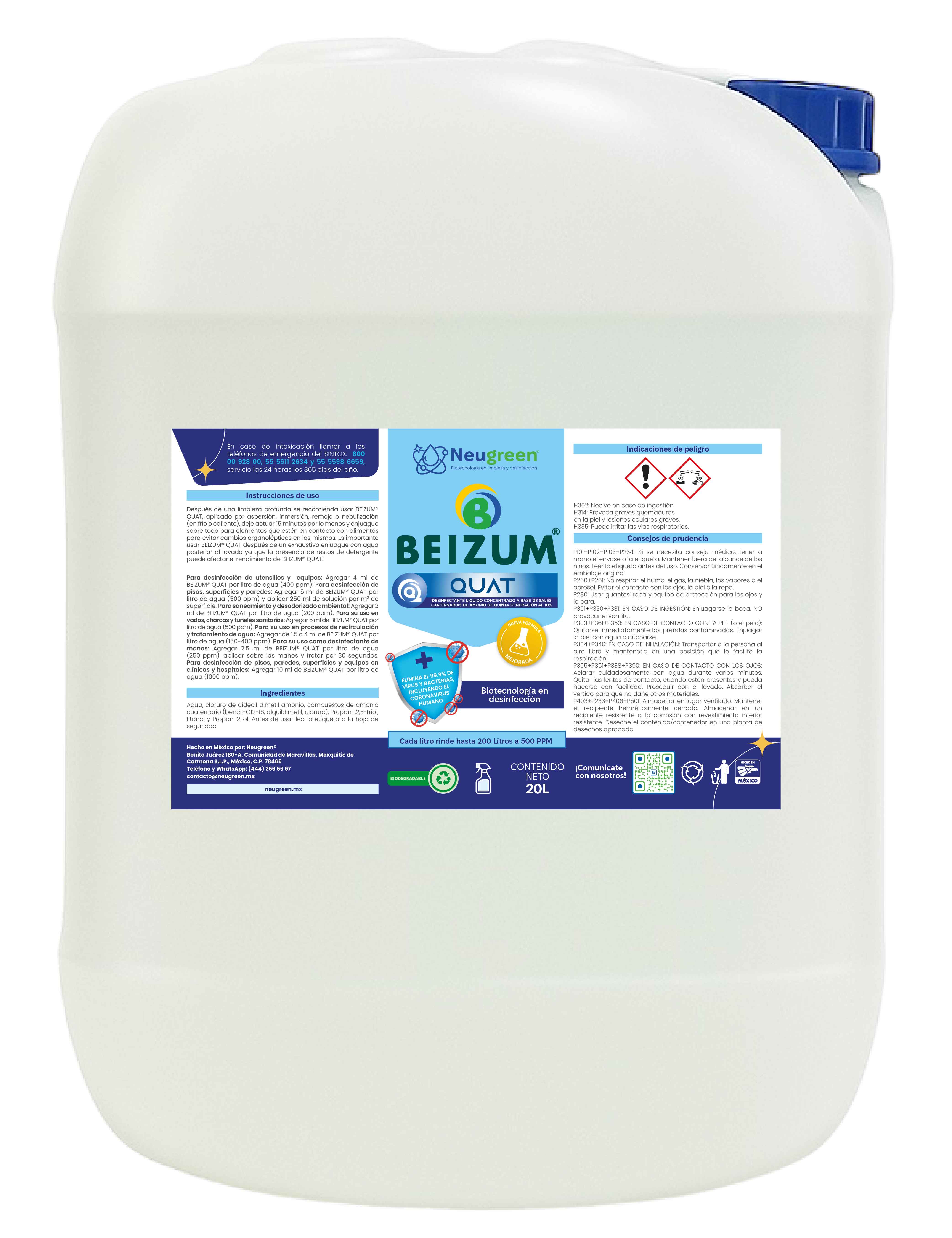 El BEIZUM® QUAT 10% es un desinfectante y biocida líquido ultra concentrado de alto nivel, formulado con sales cuaternarias de amonio de quinta generación al 10%, ofreciendo un amplio espectro de acción contra bacterias, virus, hongos y esporas.