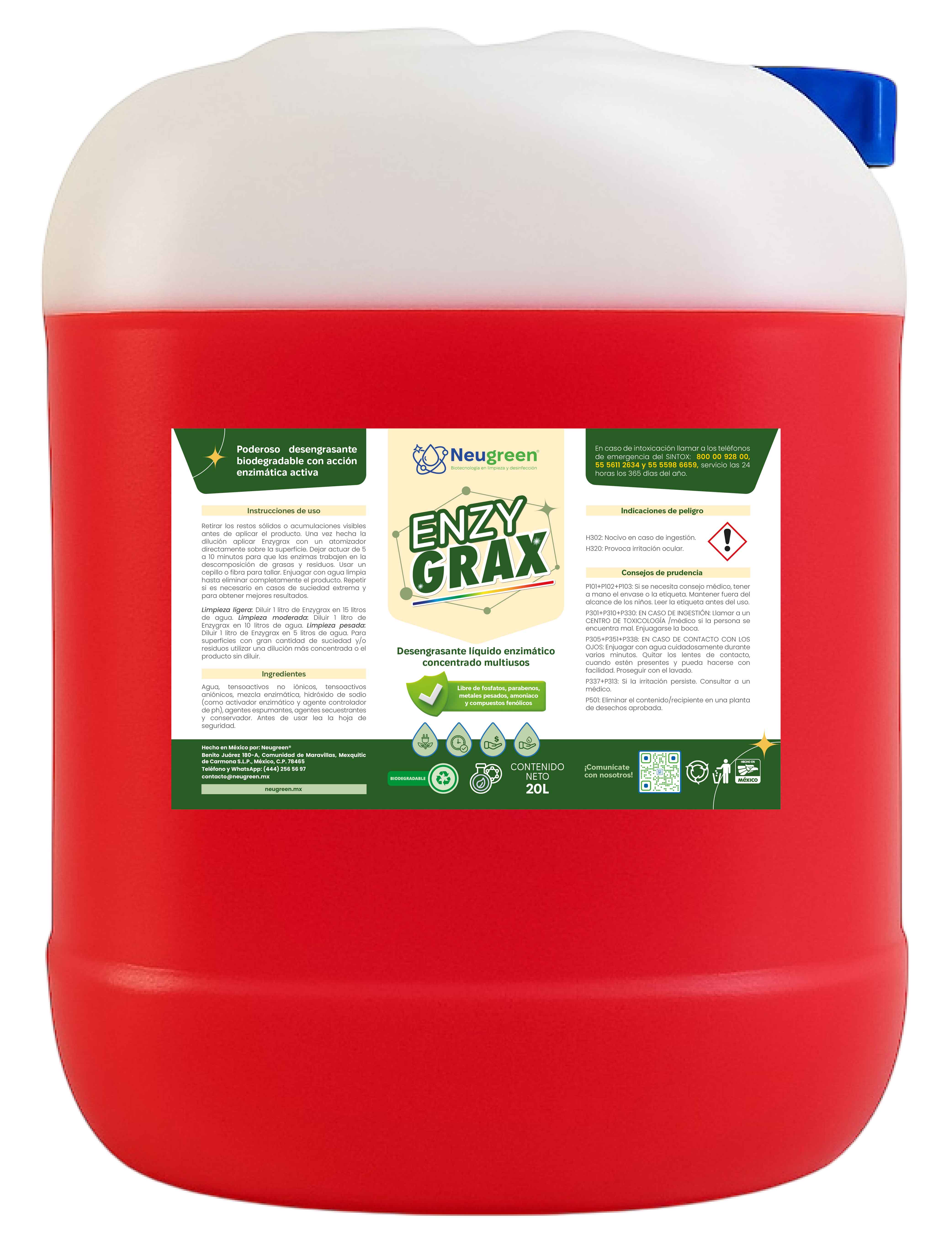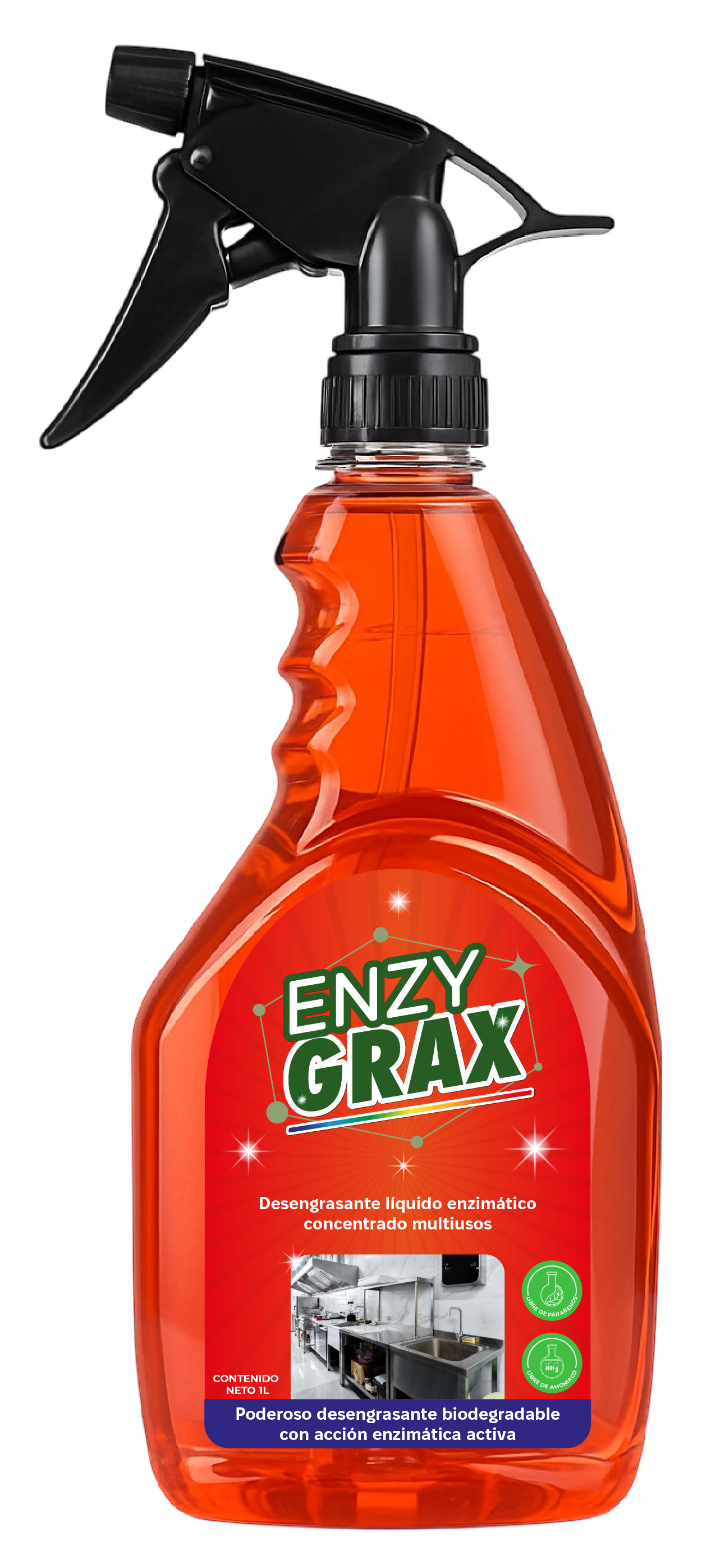 El ENZYGRAX es un desengrasante líquido enzimático ecológico y concentrado, formulado para remover de manera eficiente grasa, aceites y residuos orgánicos en múltiples superficies sin dañar materiales ni dejar residuos tóxicos.