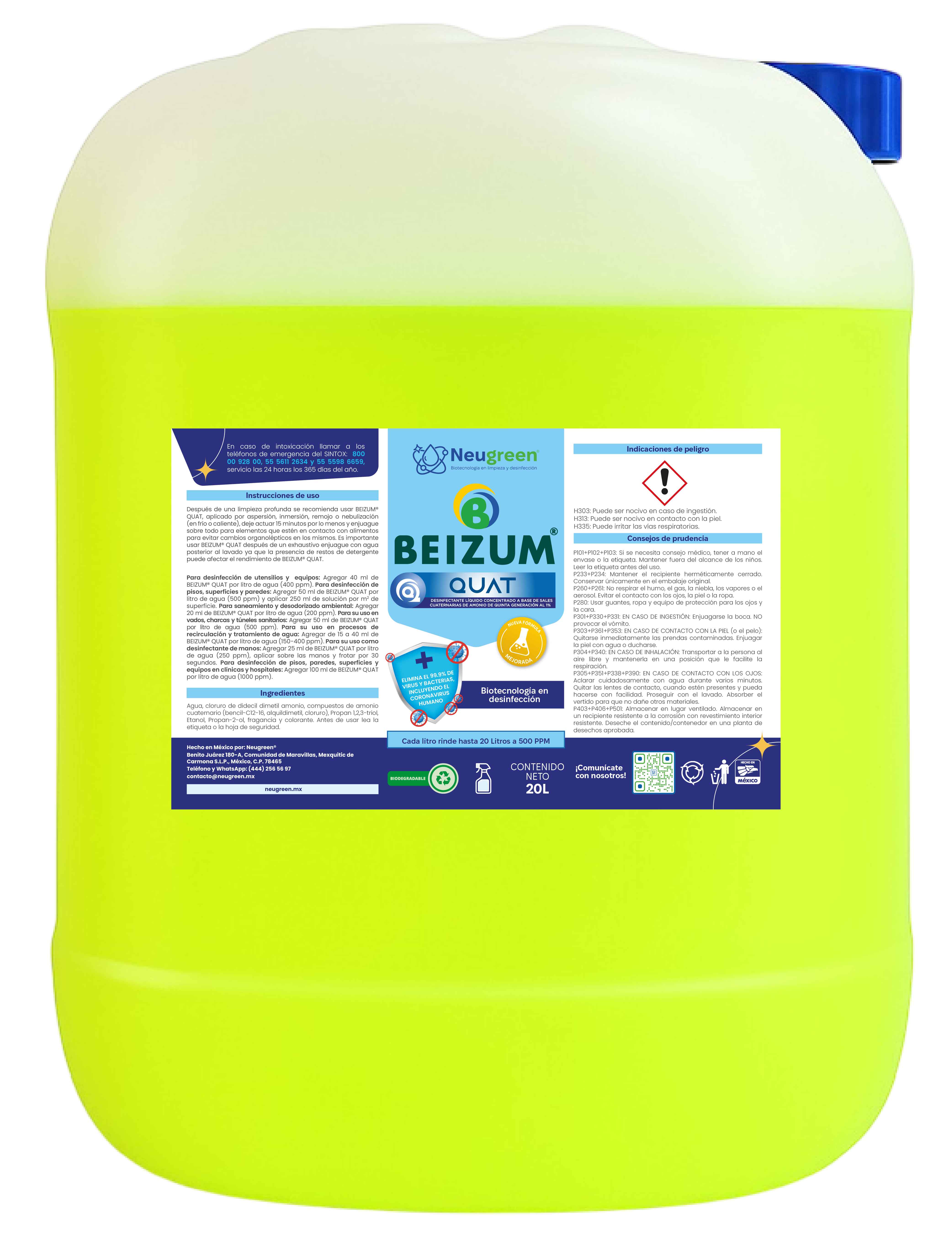 El BEIZUM® QUAT 1% es un desinfectante líquido concentrado de alto nivel, formulado con sales cuaternarias de amonio de quinta generación al 1%, ideal para la desinfección eficiente de superficies en entornos comerciales, industriales y de salud.
