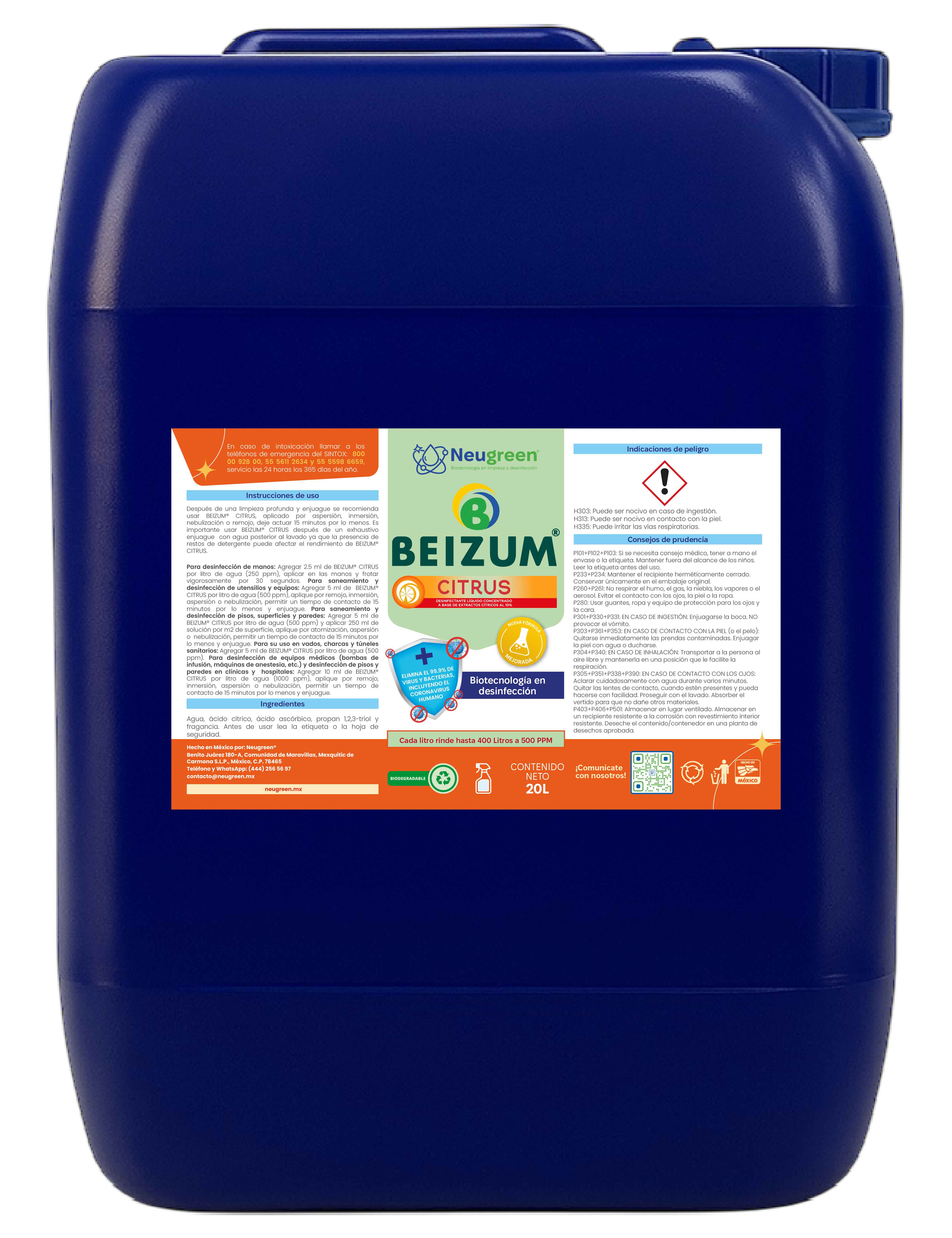 El BEIZUM® CITRUS es un desinfectante líquido ultra concentrado de alto nivel, elaborado con extractos cítricos al 10%, ideal para eliminar bacterias, virus y hongos de manera segura y eficaz. Su base natural ofrece una alternativa ecológica a los desinfectantes tradicionales, proporcionando desinfección profunda con un agradable aroma fresco a cítricos.